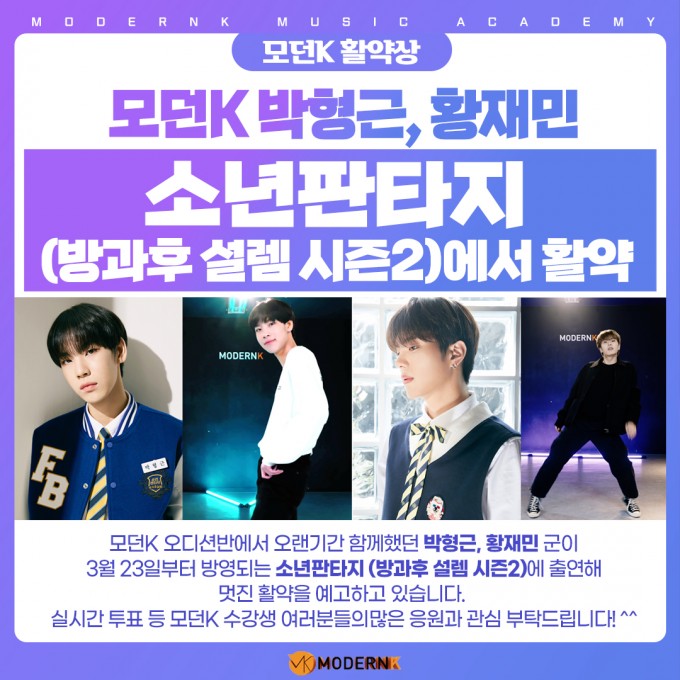 모던K 오디션반에서 오랜기간 함께했던 박형근, 황재민 군이 3월 23일부터 방영되는 소년판타지 (방과후 설렘 시즌2)에 출연해 멋진 활약을 예고하고 있습니다.