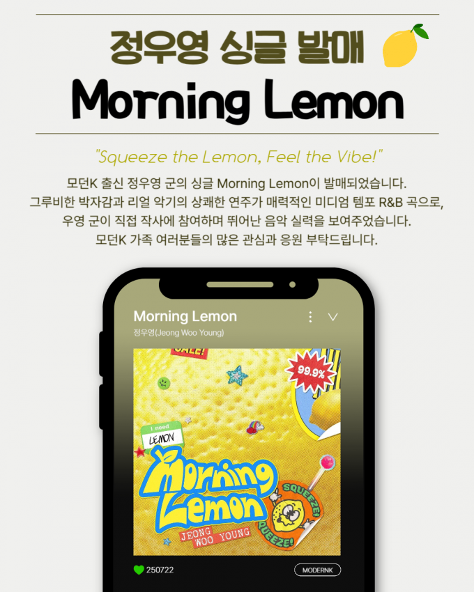 우영 군의 앨범 Morning Lemon에 모던K 가족 여러분들의 많은 관심 부탁드립니다