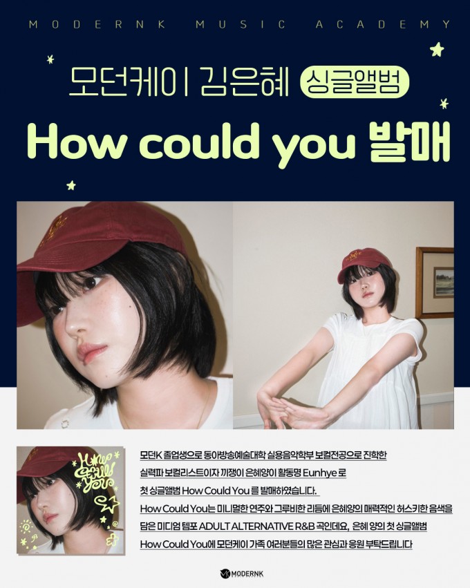 모던K 졸업생으로 동아방송예술대학 실용음악학부 보컬전공으로 진학한 실력파 보컬리스트이자 끼쟁이 은혜양이 활동명 Eunhye 로 첫 싱글앨범 How Could You 를 발매하였습니다.