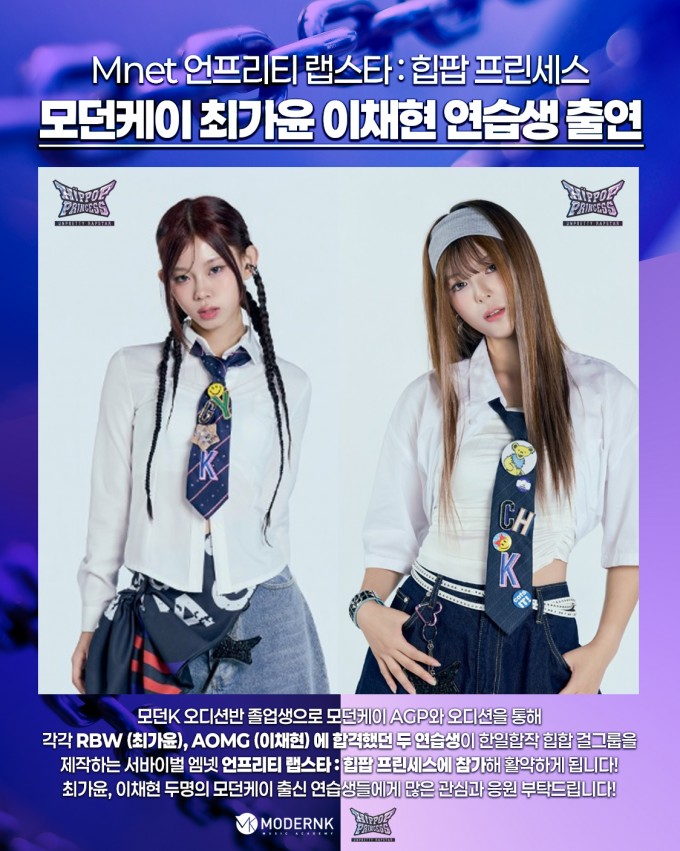 모던K 오디션반 졸업생으로 모던케이 AGP와 오디션을 통해 각각 RBW (최가윤), AOMG (이채현) 에 합격했던 두 연습생이
