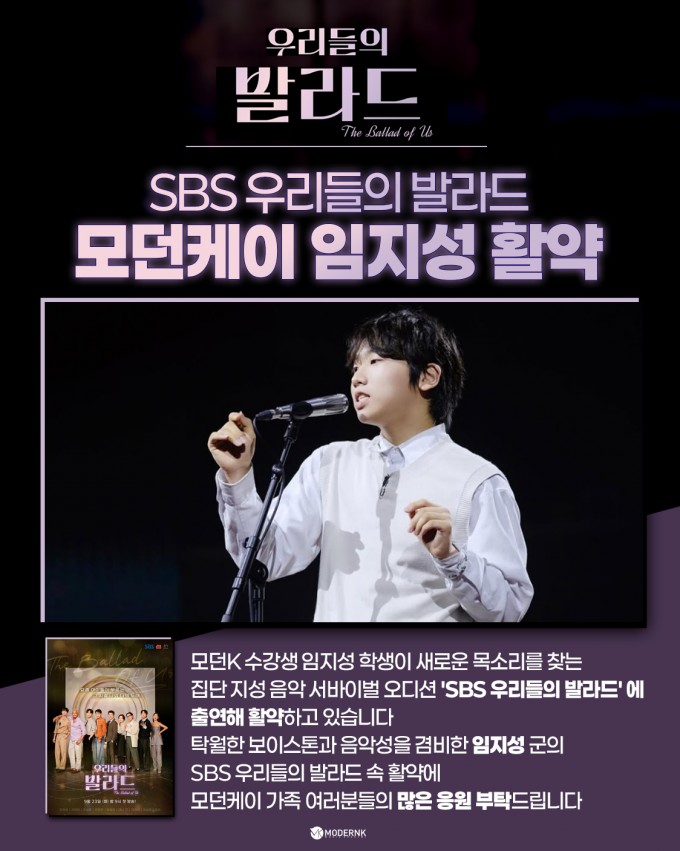 모던K 수강생 임지성 학생이 새로운 목소리를 찾는 집단 지성 음악 서바이벌 오디션 'SBS 우리들의 발라드' 에 출연해 활약하고 있습니다