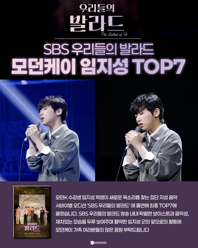SBS 우리들의 발라드 방송 내내 탁월한 보이스톤과 음악성, 재치있는 모습을 두루 보여주며 활약한 임지성 군의 앞으로의 활동에 모던케이 가족 여러분들의 많은 응원 부탁드립니다