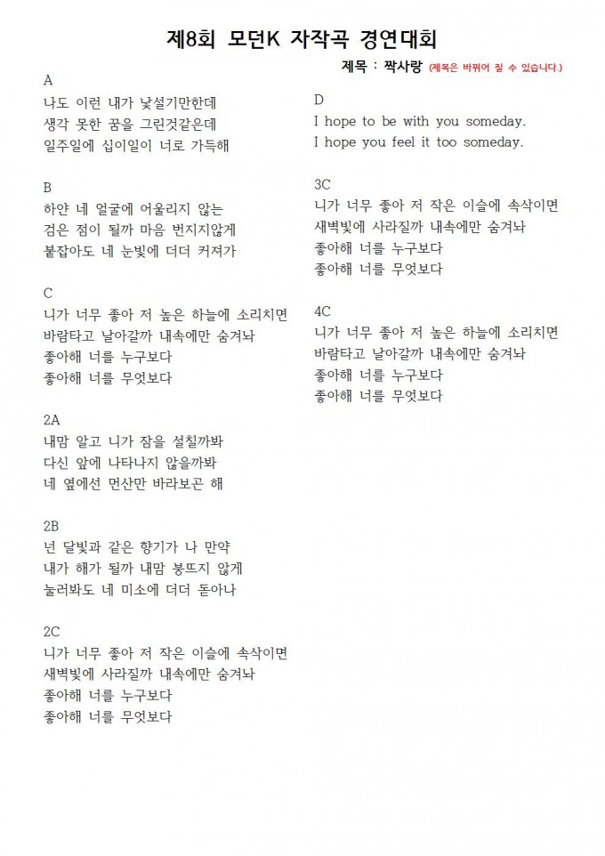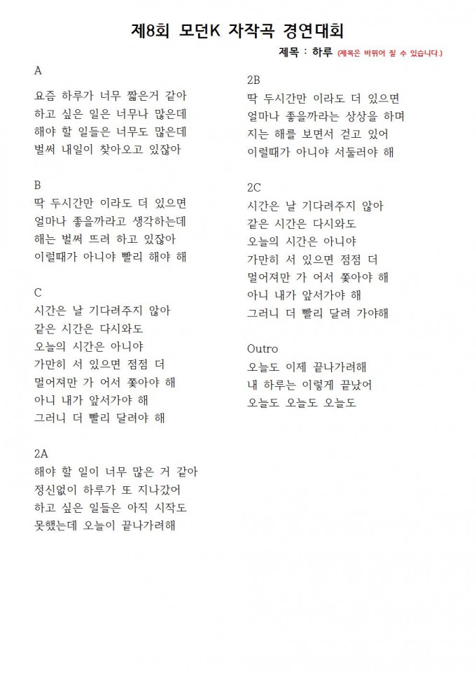 2) 1절 분량(1분 30초 가량) 으로 준비합니다.(장르 제한 없음)