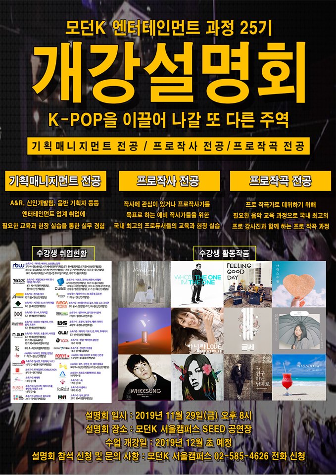 프로작사가를 꿈꾸는 분들을 위한 프로작사 전공과 엔터테인먼트 업계 취업을 희망하시는 분들을 위한 기획매니지먼트 전공으로 나뉘어져 있는 모던K 엔터테인먼트 과정 25기가 12월 부터 개강 됩니다.