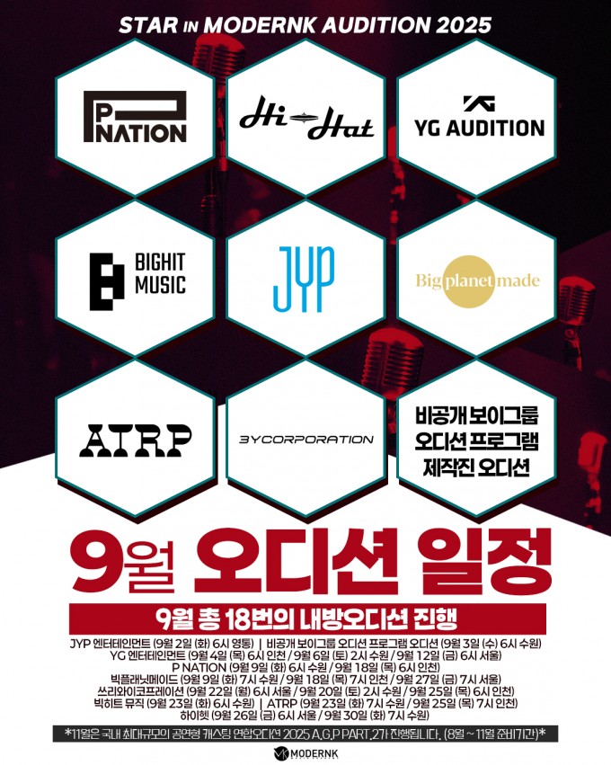 YG, JYP, 빅히트 뮤직, P NATION, 빅플래닛메이드 등 9월 한달간 총 18번의 내방오디션 진행!