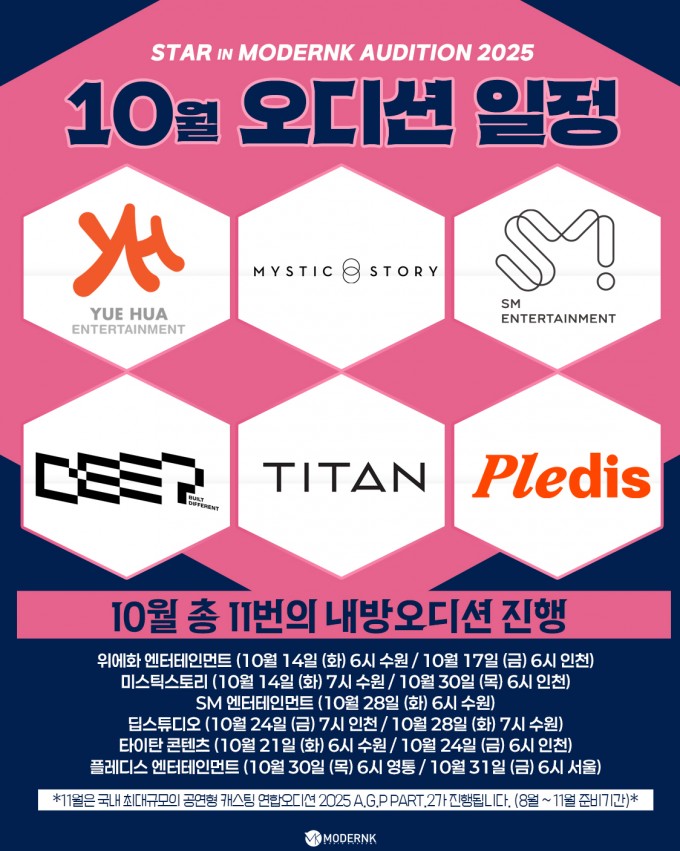 SM, 플레디스, 위에화, 미스틱스토리 등 10월 한달간 총 11번의 내방오디션 진행!